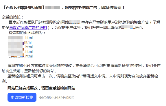 日前,百度站長平臺發布公告稱,“站點整改反饋功能”已正式上線。據官方表示,首批通知將以站內消息、郵件以及短信三種形式發送給石榴算法命中站點站長。收到通知后,站長需在96小時內進行網站整改工作,且應在整改完成后申請重新檢測(廣州網站建設(www.www.zbjdyw.com)提醒注意:申請重新檢測的機會只有一次)。